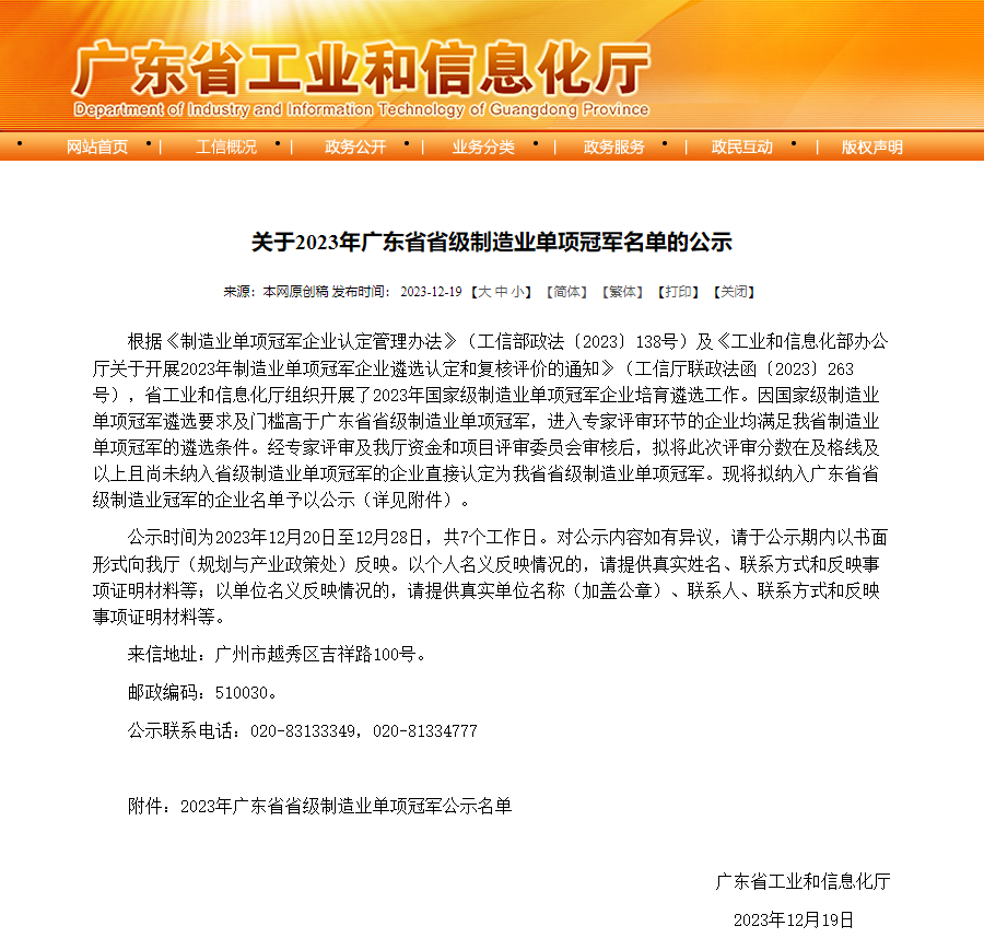 米兰milan高能荣获“2023年广东省制造业单项冠军”